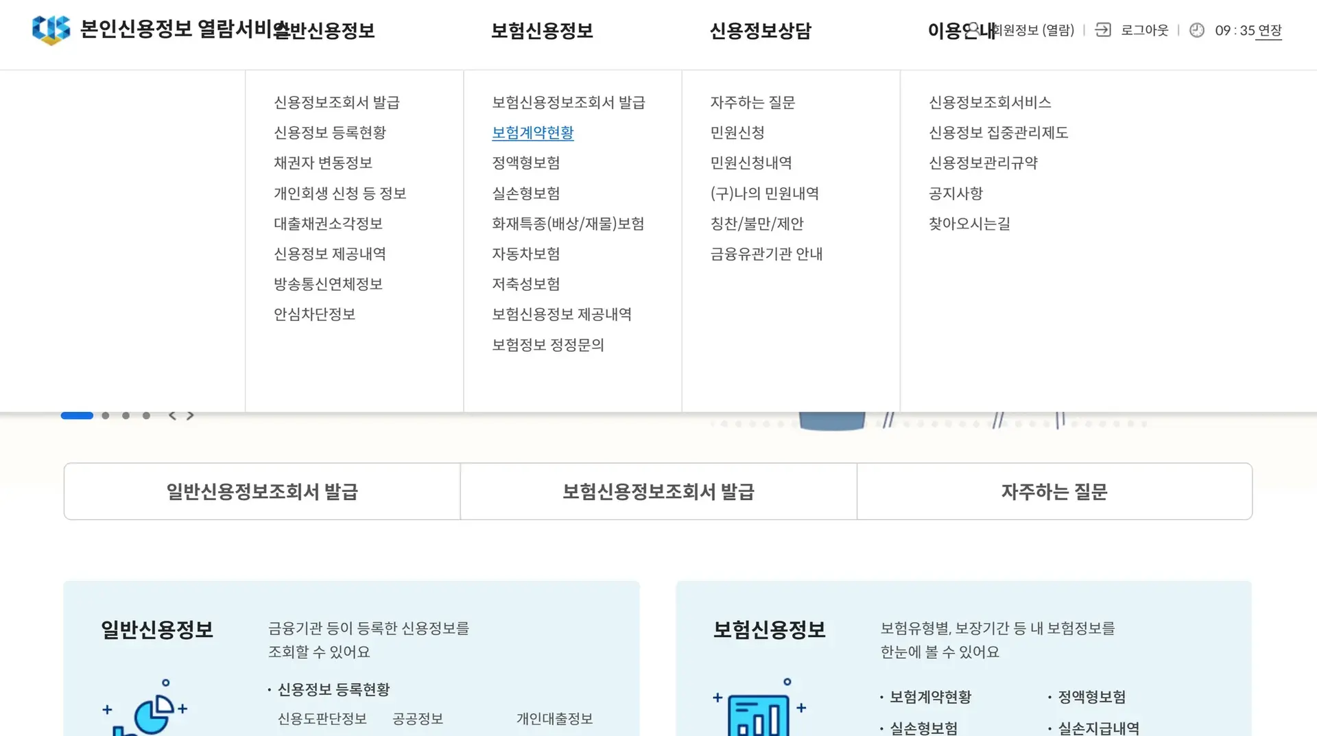 [보험신용정보] → [보험계약현황] 을 선택하세요.