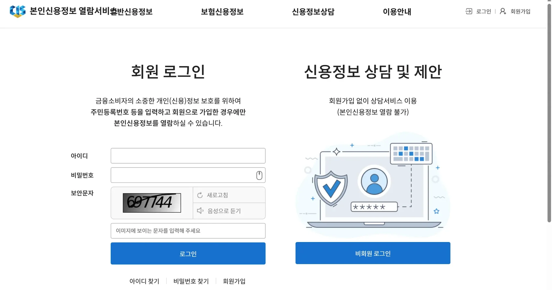 본인신용정보 열람서비스에 접속합니다.